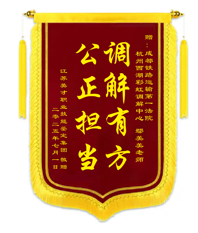 2025年7月1日,江苏英才职业技能鉴定集团和JYPC全国职业资格考试认证中心将一面印有“调解有方,公正担当”的锦旗寄往成都铁路运输第一法院和杭州西湖彩虹调解中心,感谢法院庭前化解了JYPC和四川省人力资源和社会保障厅的名誉权纠纷,使双方从“即将对薄公堂”到“心平气和”,最终以“案结事了人和”画上了圆满的句号。在此,谨以诚挚的敬意向调解员鄢美美女士表达由衷的感激之情!